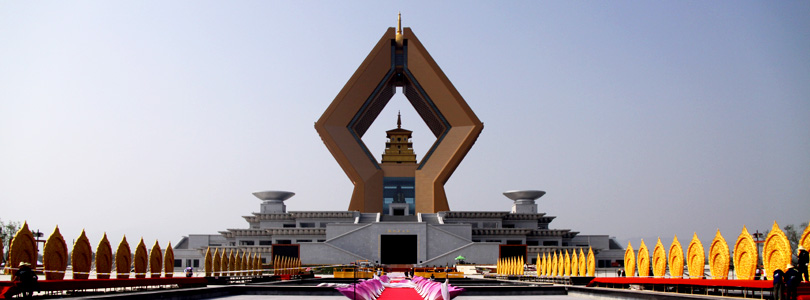 法門寺文化區建設規劃位于法門鎮新鎮區的東側,南北長2165米,東西寬952米,總占地面積3092畝。景龍路以北為佛區,在以岐陽路東西兩側分別為僧區、法區,三區各占地約1000畝。如此形成北方中央是佛指舍利靈境世界,西方為佛教文化苑,東方為寺區,即佛、法、僧,佛教三寶俱在。佛在中央,法、僧東西護持,佛教大乘、小乘兼弘,顯密圓滿,合十舍利塔居于佛區的中央, 功能及設施完善。總建筑面積為76690平方米,其中地上為60225平方米,地下約為16465平方米。工程總高147米,寬54米(裙房底盤寬253米),合十雙手的特殊造型,其恢宏的氣勢不僅傳承佛教建筑的特色,更以現代化的技術融合古今中外建筑之精華。